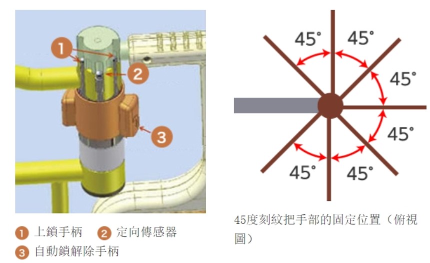 -再次到達45度位置時定向傳感器自動感知並自動上升上鎖手柄鎖定把手部